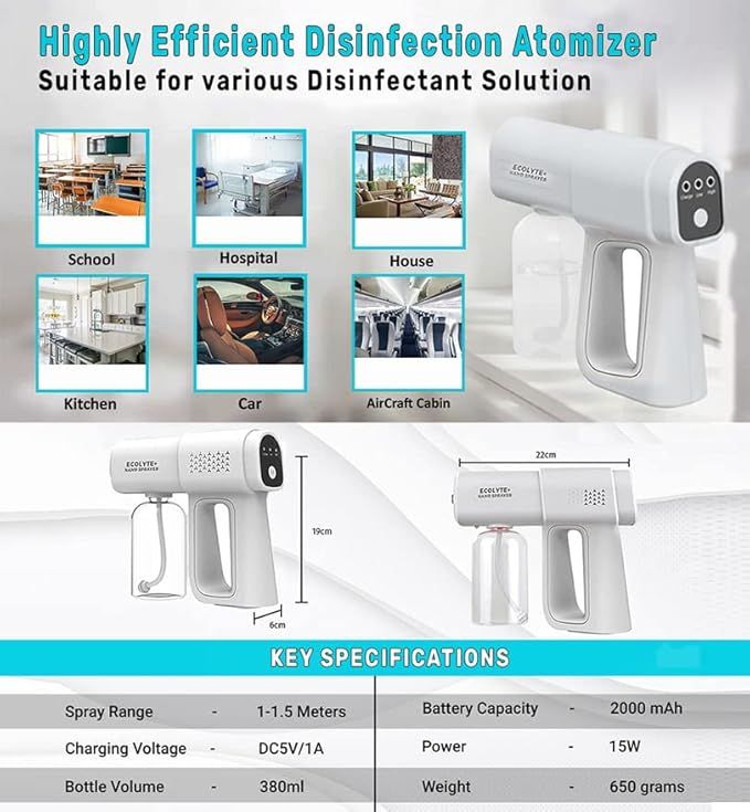 Nano Spray Disinfectant Mist Gun: Features:Handheld & Rechargeable:Conveniently rechargeable with a blue light atomization feature for efficient disinfectionVersatile Use:Perfect for home, office, school,...